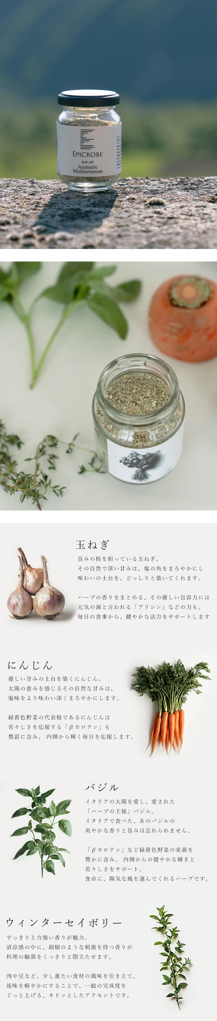 素材の良さを、最大限に引き出す このハーブソルトは、決して主張しすぎることはありません。ただ、素材の持つ本来の良さを引き出しながら、いつもの一皿を簡単により美味しく本格的なものへ変えてくれます