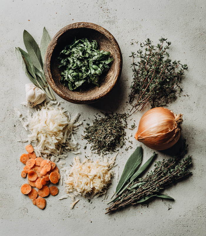 特別な日のためだけではなく、毎日の何気ない一皿の質を劇的に引き上げるのがこのブレンドの真骨頂です。例えば、いつもの目玉焼き。仕上げに一振りすれば、卵の甘みが「にんじん」や「玉ねぎ」の凝縮されたコクと響き合い、タイムやセージの凛とした香りがキッチンの空気を一変させます