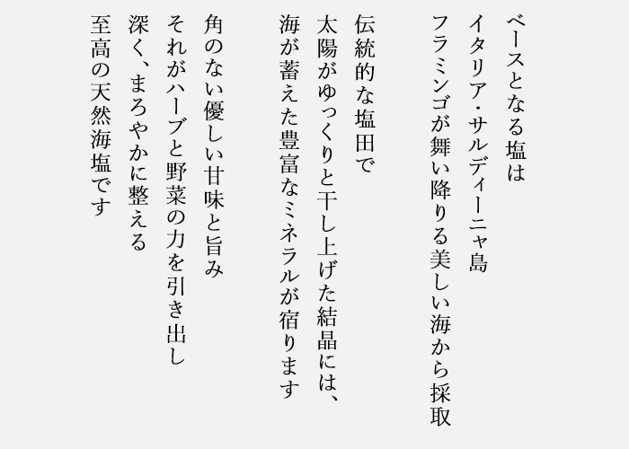• ハーブソルトの塩はイタリアのサルディーニャ島の天日海塩を使用している