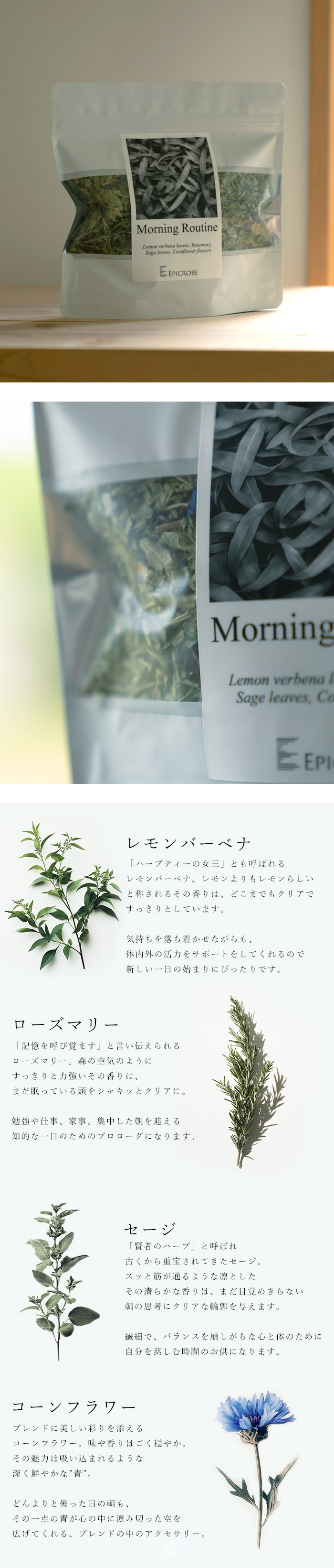 レモンバーベナとローズマリーの爽やかな香りが五感を覚まし、セージが思考をクリアに。新しい一日を心地よく始めるためのブレンドです