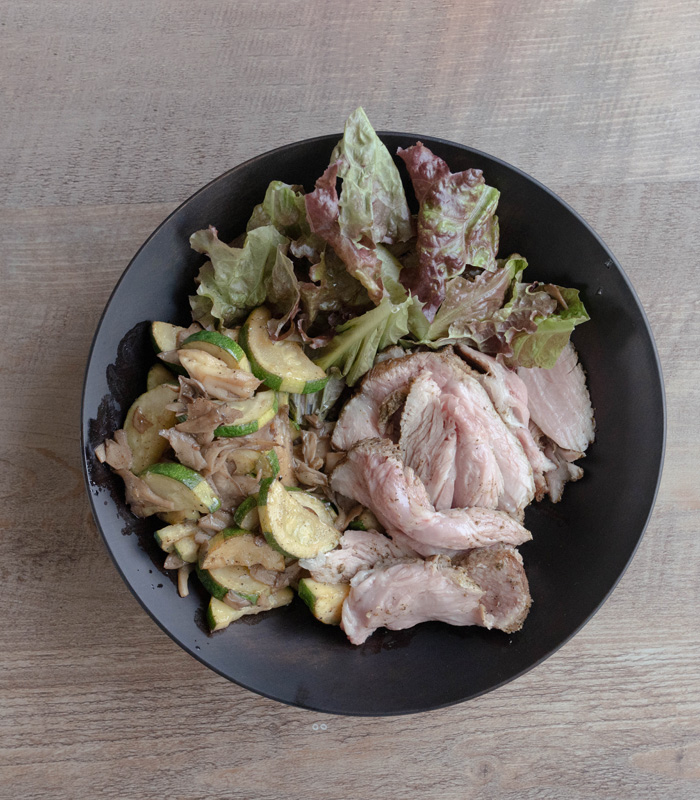 6.薄くスライスして、付け合わせの野菜と一緒に盛り付ける。