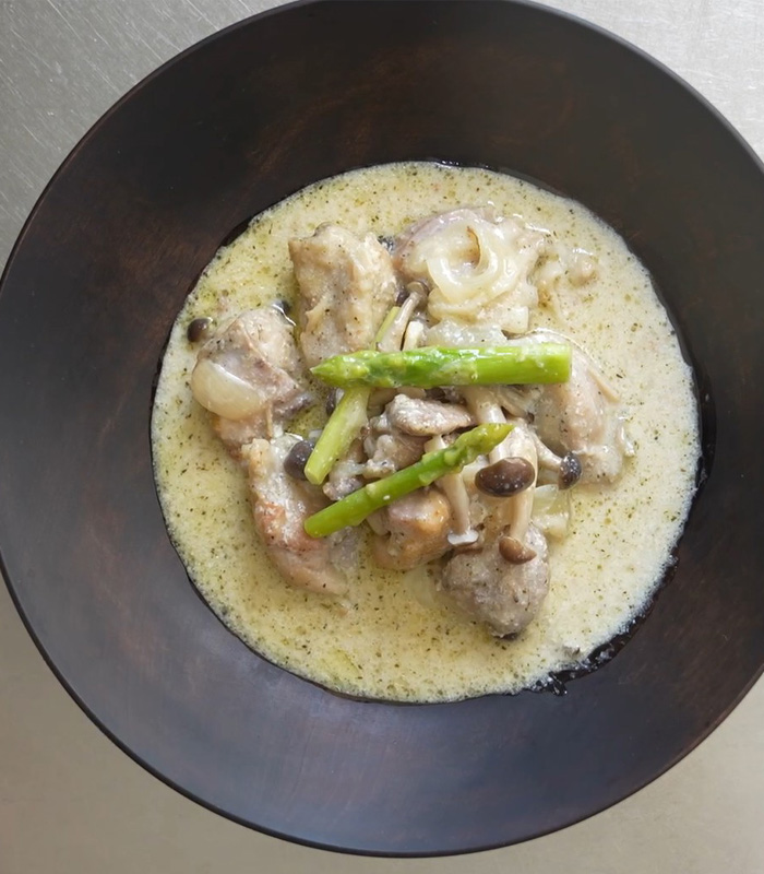 5.野菜に油が馴染んだら、牛乳とJuniper&Garlic herbs、アスパラを入れて弱火で煮込む