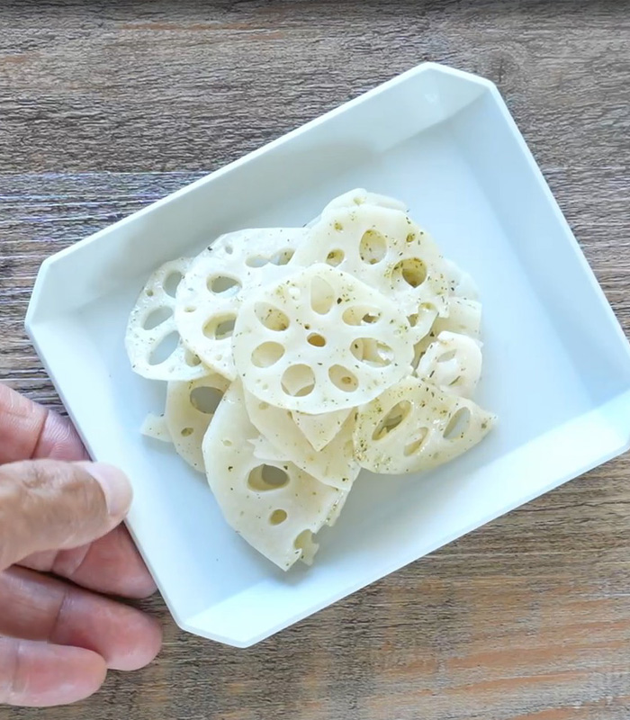 1.沸騰したお湯にスライスしたれんこんを入れ、さっと茹でる